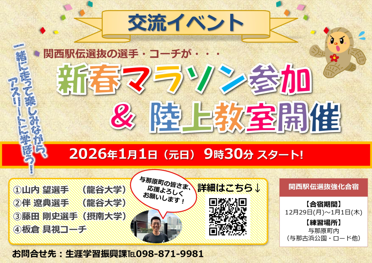 12月29日から1月1日まで関西駅伝選抜チームの選手・コーチが与那原町で強化合宿を行っています。その一環として、新春マラソン大会への参加や地域住民との交流イベント(子ともたちとの陸上教室など)を行います。交流イベントチラシ